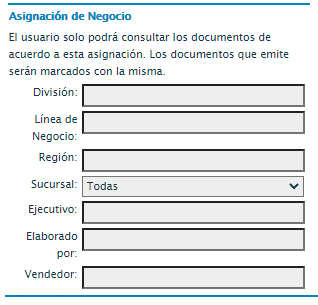 - Elimina cualquier dato que se encuentre capturado en los campos (División, Línea de Negocio, Región, Sucursal, Ejecutivo, Elaborado por y Vendedor), la sección deberá quedar como se muestra a continuación.