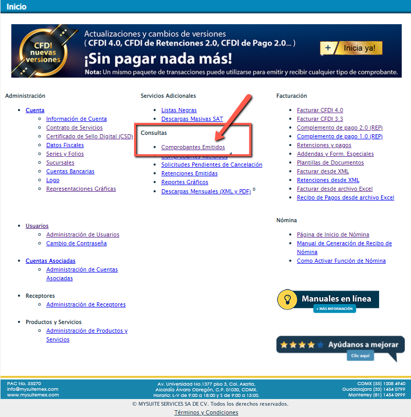 - Ingresa a la sección de “Comprobantes Emitidos”, está debajo del menú “Consultas” dentro de la página de "Inicio".