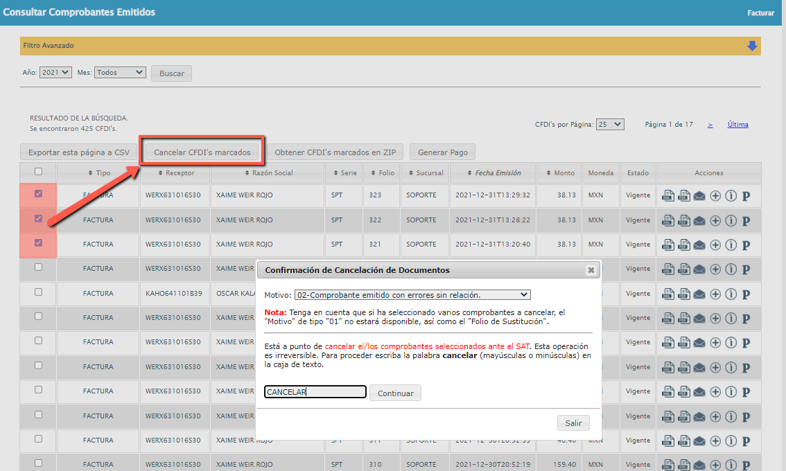 Una vez seleccionados da clic en el botón “Cancelar CFDI´s marcados”. Aparecerá una ventana llamada “Confirmación de cancelación de Documentos”, donde te pedirá que elijas el “Motivo” de la cancelación mediante el uso de la lista desplegable.