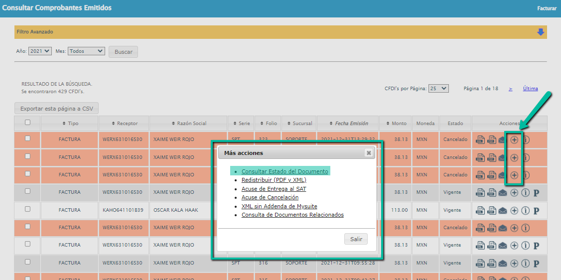 7. En la columna “Estado” verás información sobre el estatus en que se encuentra la factura; estos pueden ser: