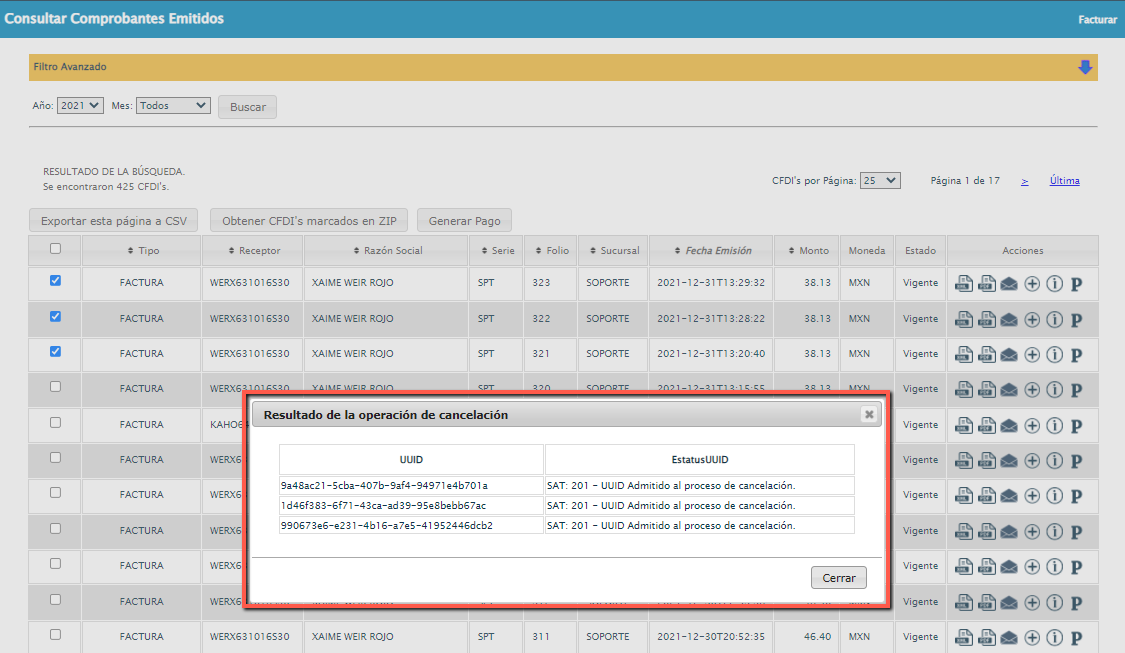 4. En la próxima pantalla verás que la o las facturas que solicitaste cancelar aparecen sombreadas en color azul, y en la columna de “Estado” se muestra el estatus “Vigente”: