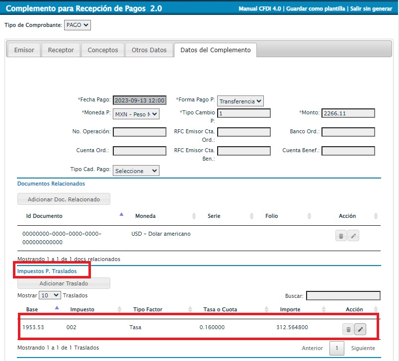“Tasa O Cuota P”: Se colocó el valor de la tasa o cuota del impuesto que se traslada en los documentos relacionados, para fines de este ejemplo: 0.160000 por ser un traslado de IVA.