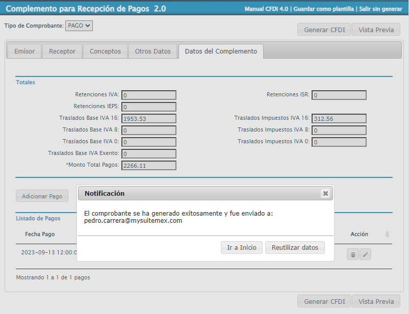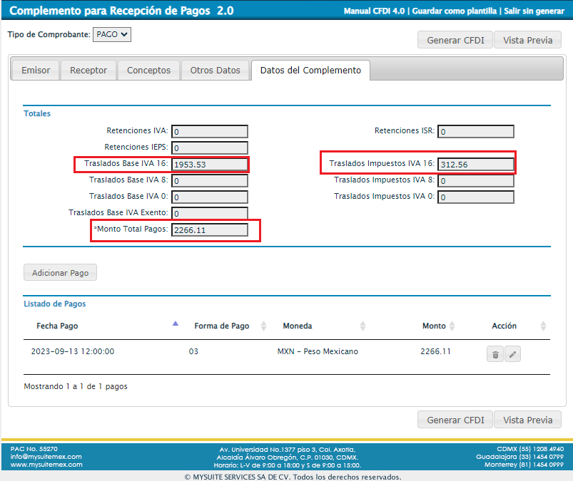 Se dará cuenta que la sección de “Totales” se llenó de forma automática con la información de los documentos relacionados y los datos del pago.