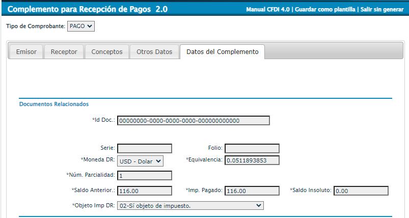“Saldo Insoluto”: Debe ser mayor o igual a 0 y debe calcularse de los campos: Saldo Anterior: 116.00 (USD) menos el Imp. Pagado: 116.00 (USD), este ejemplo se capturó 0.00 porque se está liquidando la factura con un solo pago.