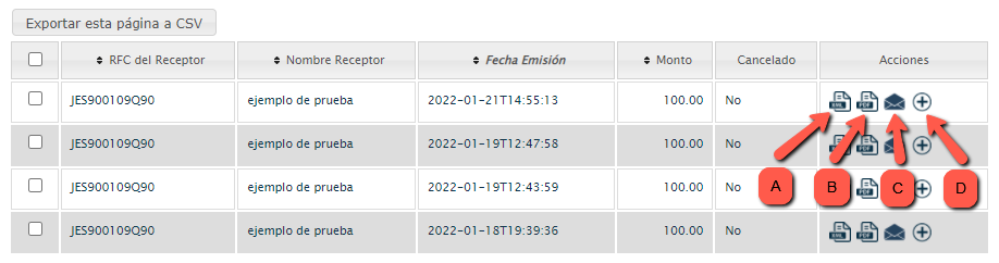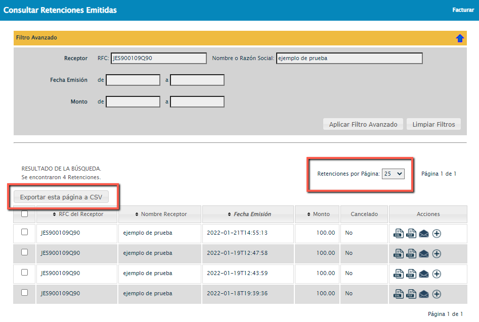 El resultado que visualizas en pantalla lo podrás exportar a un documento de Excel dando clic en el botón “Exportar esta página a CSV” y podrás manipular el numero de registros que se muestran en pantalla con la opción de “Retenciones por Página”, la cual te dará opción de 25, 50, 100, 200, 300 y 500 registros por página.