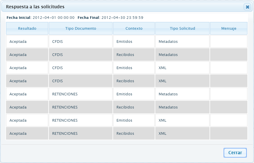 - Tipo Solicitud: Este filtro te permite ver las solicitudes por tipo, es decir si son XML´s o METADATOS, incluso ambos.