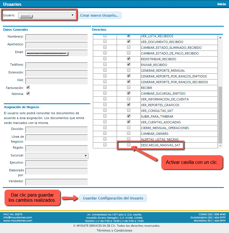 Nota: Este procedimiento lo podrás realizar para activar el servicio de descargas masivas para el usuario administrador o para cualquier otro usuario existente en la cuenta, si es que así lo requieres.