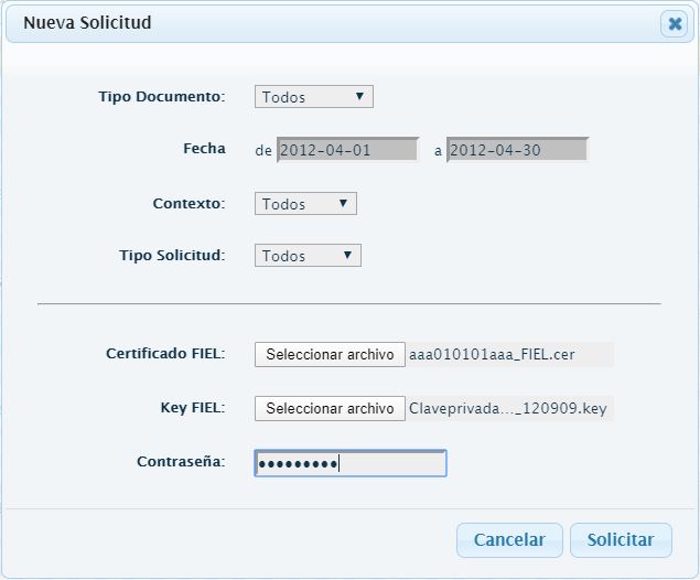 - En la ventana emergente llamada “Nueva Solicitud” deberás indicar los parámetros de la solicitud.