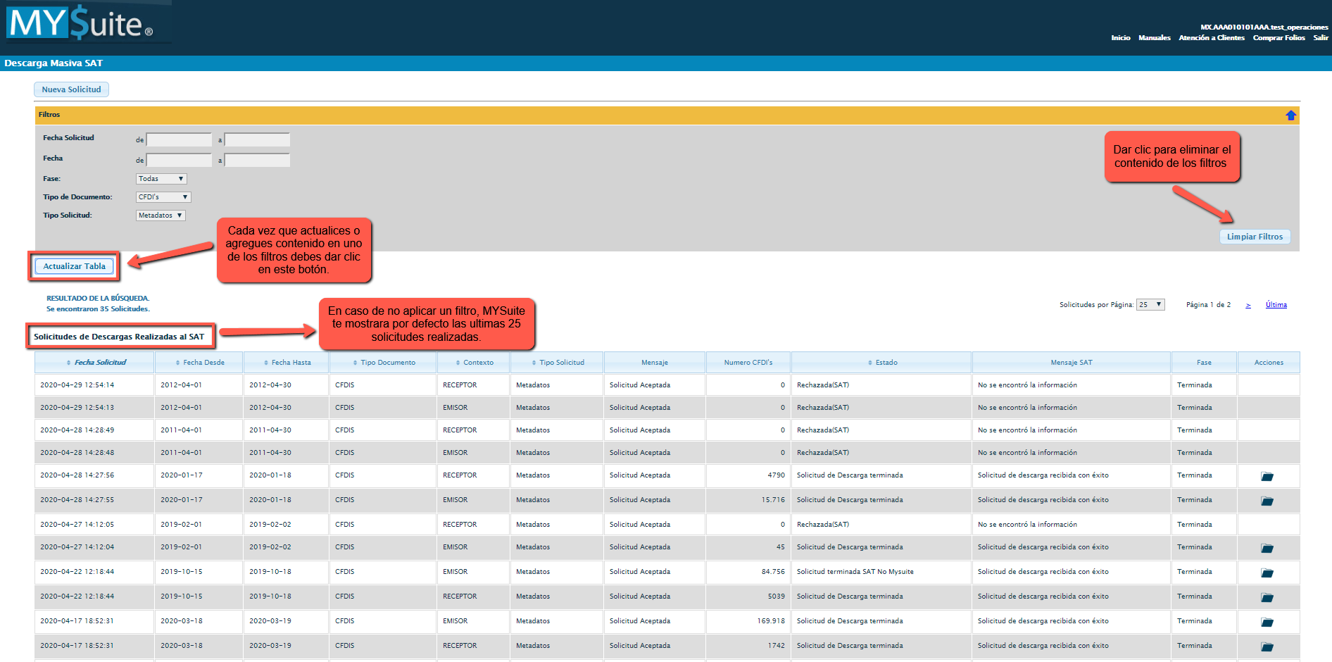 Al especificar el filtro deberás dar clic en el botón “Actualizar Tabla” para que MYSuite te muestre el resultado en la tabla llamada SOLICITUDES DE DESCARGAS REALIZADAS AL SAT.