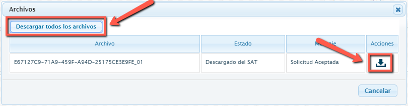 A) El botón llamado “Descargar todos los archivos” te permitirá descargar de manera masiva los archivos de la solicitud realizada, por ejemplo, si tu solicitud fue de tipo XML se descargarán en un archivo .ZIP dichos documentos.