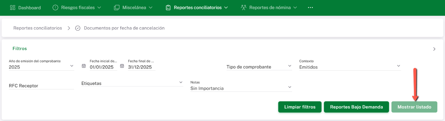 Una vez capturado el rango de fechas de cancelación, deberás dar clic en el botón “Mostrar Listado”.