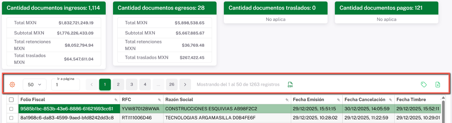 Paginación: Indica el número de páginas disponibles y permite navegar entre ellas para consultar los registros obtenidos en tu búsqueda.