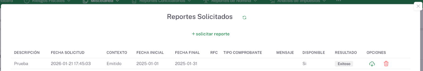 Descargar Reporte: Al dar clic en esta opción se descargará un archivo con extensión CSV, el cual contendrá la información resultante de los filtros aplicados al momento de presionar el botón “Solicitar Reporte”.