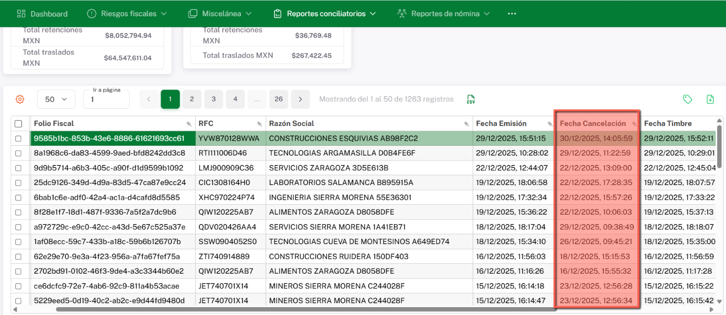 Por ejemplo, sombreamos en color rojo una factura con fecha de cancelación del día 27/08/2025, dicha fecha corresponde al parámetro de Fecha Inicial y Final de Cancelación y de la misma manera podrás observar que dicho documento tiene una fecha de emisión diferente.