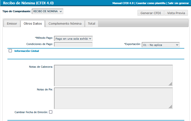 4 En la pestaña “Otros Datos” aparecerán precargados los campos de “Método de Pago” y “Exportación”.