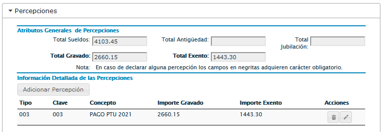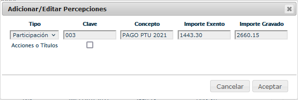 Capturar la información en los campos: “Tipo”, “Clave”, “Concepto”, “Importe Exento” y/o “Importe Gravado” y una vez agregados los datos da clic en el botón “Aceptar” para que la percepción quede agregada en el complemento.