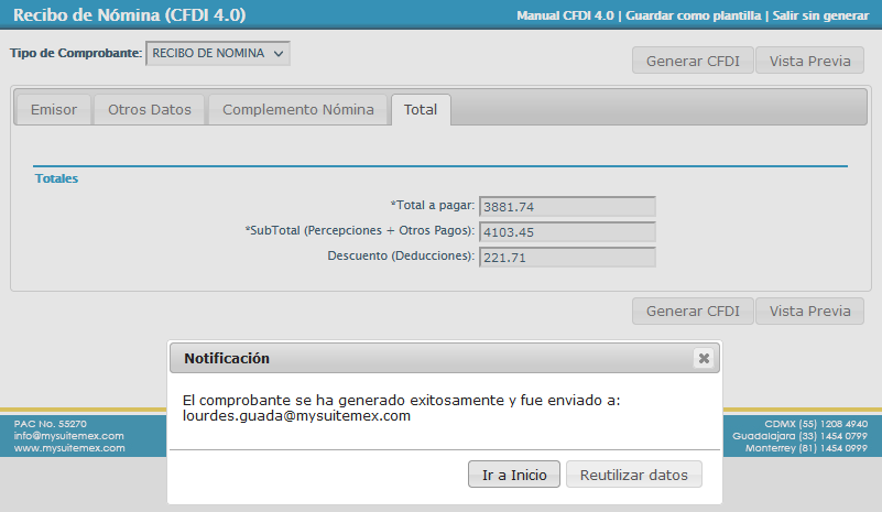18 Posteriormente MYSuite te indica que el CFDI se ha emitido exitosamente y que el mismo se ha enviado al correo del empleado.