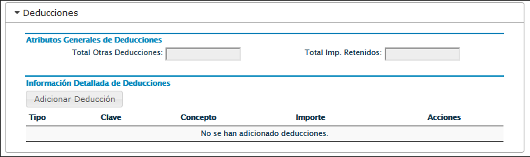 En la sección de “Atributos Generales de Deducciones” coloca la información solicitada dependiendo de las deducciones que haya agregado, en el campo “Total Imp. Retenidos” coloca el importe del ISR, y en el campo “Total Otras Deducciones” coloca la suma de las demás deducciones.