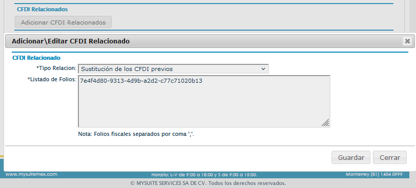 5 En caso de que este comprobante se encuentre sustituyendo a otro que contenga algún error de clic en el botón de Adicionar CFDI Relacionado de la sección “CFDI Relacionados”, en el campo Tipo de Relación elija la opción: “Sustitución de CFDI previos” y en el campo Listado de Folios coloque el Folio Fiscal (UUID) del CFDI erróneo, con ello usted estará sustituyendo dicho comprobante, finalmente de clic en el botón "Guardar".