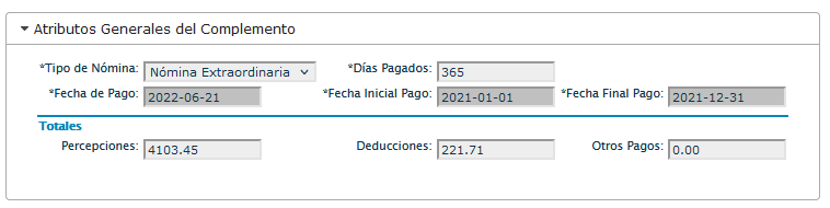 Ahora da clic en la pestaña “Complemento Nómina”, en la opción “Atributos Generales del Complemento” coloque la información correspondiente al pago de la nómina de su empleado.
