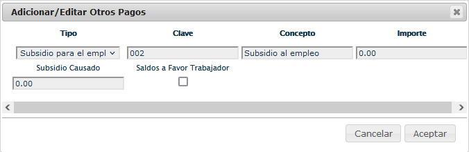 12.1 En la ventana “Adicionar/Editar Otros Pagos” captura la información como se muestra en la imagen de ejemplo, para agregar el concepto da clic en el botón “Aceptar”.