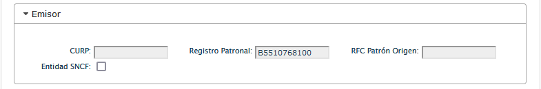 8 En la sección “Emisor” de manera opcional puedes capturar el CURP, el Registro Patronal si es persona física y si es persona moral debes colocar el Registro Patronal (si es asimilado a salario se debe omitir la información de Registro Patronal), si el pago de la nómina lo realizará un tercero, es decir un Outsoursing deberá colocar RFC Patrón Origen.