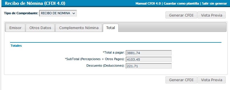 14 Pestaña “Total”, aquí podrás confirmar el cálculo final de tu comprobante en donde el campo “Descuento (Deducciones)” debe reflejar la suma de las deducciones que agregaste en el complemento de nómina, en Subtotal (Percepciones + Otros Pagos) mostrará la suma de las percepciones más otros pagos; si es que los ha agregado y finalmente en el campo “Total a Pagar” observaras la diferencia de los dos campos anteriores.