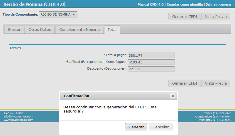 Si los datos capturados son correctos en la vista previa, podrás dar clic en el botón “Generar CFDI”.