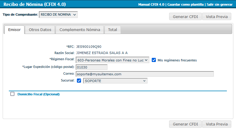 3 En la pestaña "Emisor" se encontrarán precargados tus datos y de manera opcional podrás especificar una sucursal si es que existiera, de la misma forma puedes definir el domicilio fiscal actual si es que lo requieres en dicho comprobante.