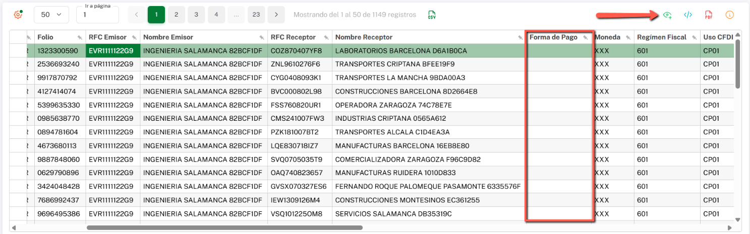 En la parte superior de la tabla de resultados encontrarás diversas funcionalidades que te permitirán administrar la información obtenida. A continuación, se describen cada una de ellas: