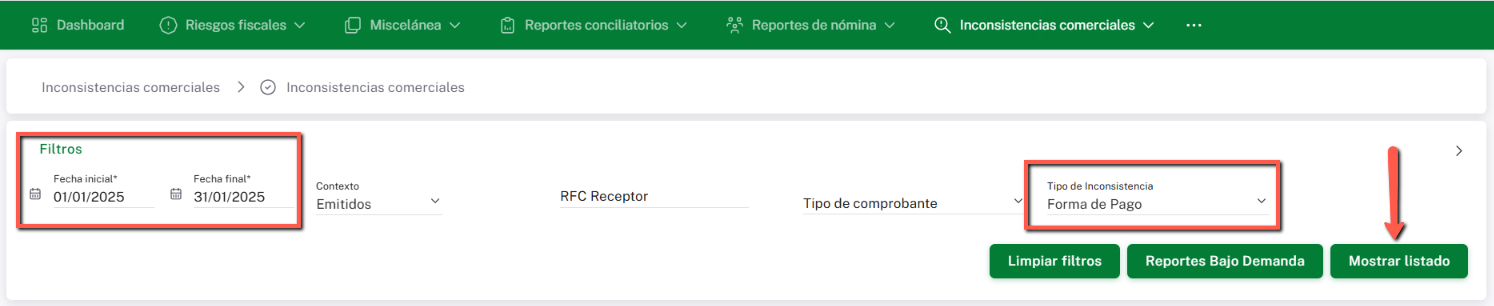 Para generar este reporte debes contemplar como mínimo un intervalo de fechas (Fecha Inicial y Final) determinado por periodo anual y en el campo “Tipo de inconsistencia” selecciona la opción: “Forma de Pago”, además permite aplicar filtros por: