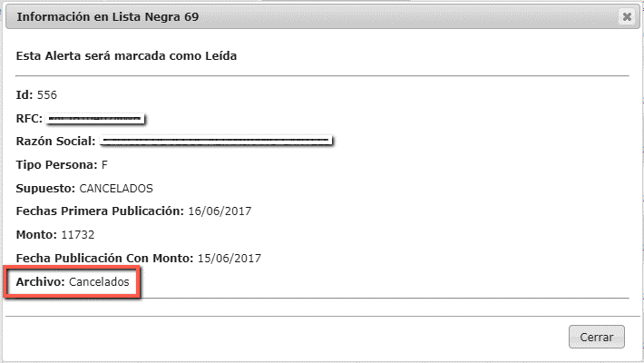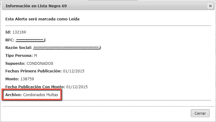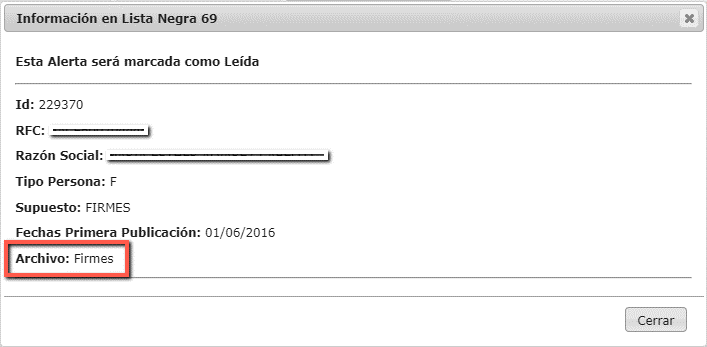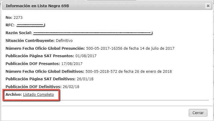 Dicho menú te mostrará el detalle sobre el supuesto en el que se encuentra cada RFC que se encuentra en la tabla de resultados y también se muestra el nombre de la lista publicada por el SAT en forma de hipervínculo, lo cual te permite descargar dicha lista que contiene el registro en cuestión, por ejemplo: