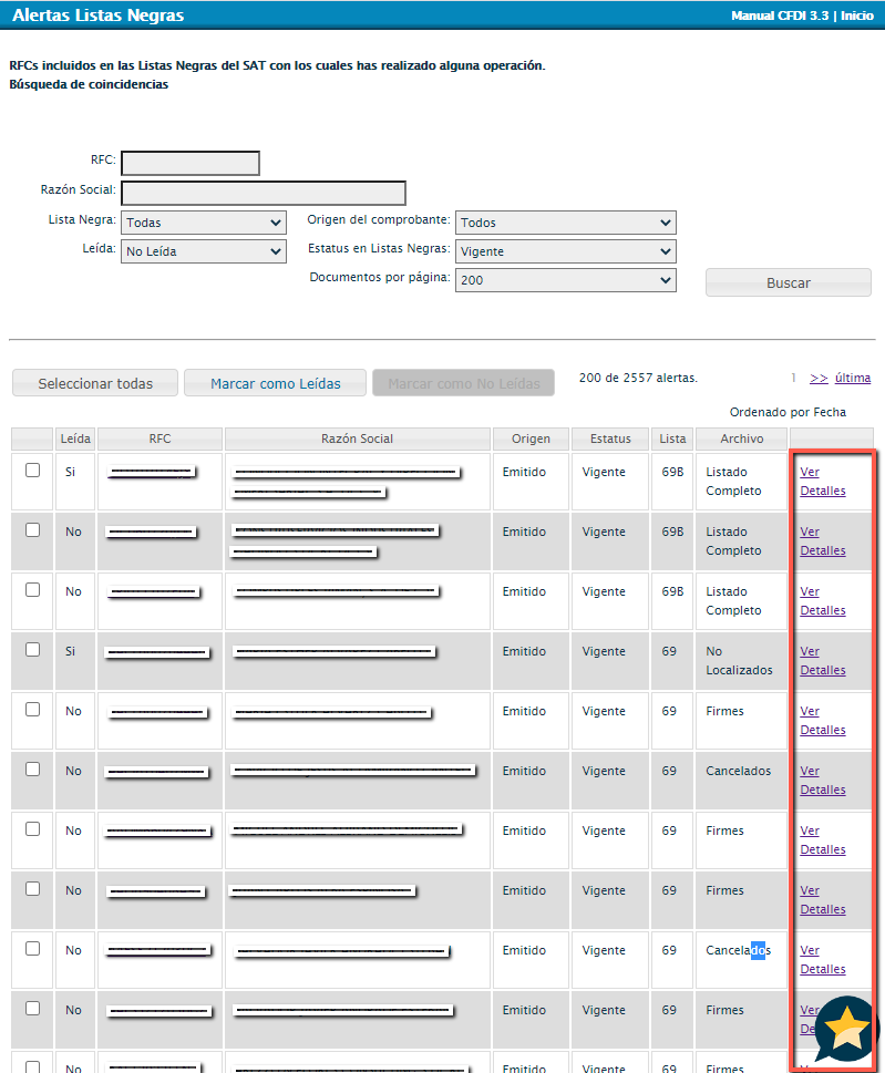 Una vez que se obtiene el resultado de la búsqueda podrás administrar el estatus de las alertas; respecto a si se encuentran marcadas como leídas o NO leídas con la ayuda de los siguientes botones: