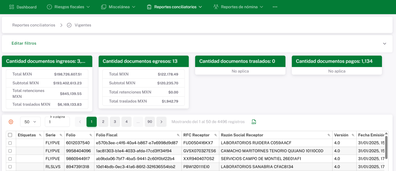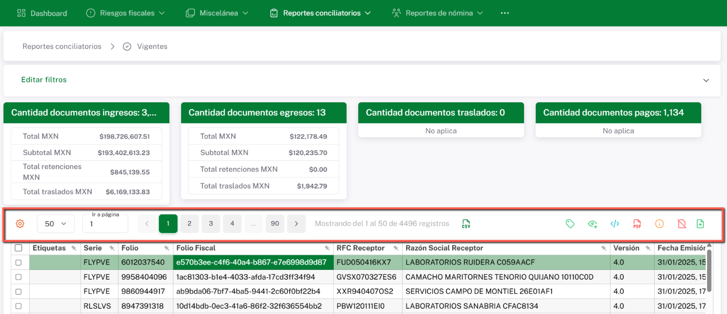 Paginación: Indica el número de páginas disponibles y permite navegar entre ellas para consultar los registros obtenidos en tu búsqueda.
