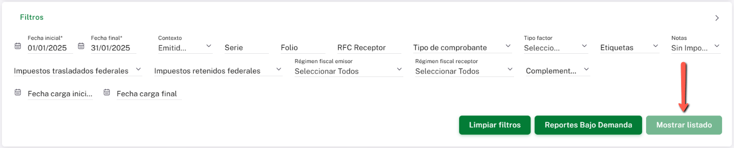 Esta opción permite generar el reporte de manera diferente a la función “Mostrar Listado”, ya que elimina la restricción de descarga limitada de 5,000 registros por vez.