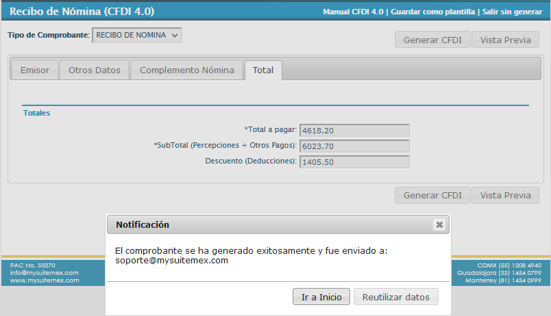 Posteriormente MYSuite te indica que el CFDI se ha emitido exitosamente y que el mismo se ha enviado al correo del empleado.