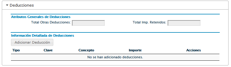 11.2 En la sección de “Atributos Generales de Deducciones” coloca la información solicitada dependiendo de las deducciones que haya agregado, en el campo “Total Imp. Retenidos” coloca el importe del ISR, y en el campo “Total Otras Deducciones” coloca la suma de las demás deducciones.