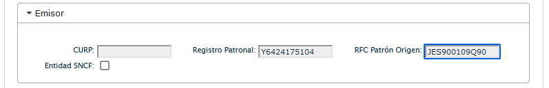 8 En la sección “Emisor” de manera opcional puedes capturar el CURP, el Registro Patronal si es persona física y si es persona moral debes colocar el Registro Patronal (si es asimilado a salario se debe omitir la información de Registro Patronal), si el pago de la nómina lo realizará un tercero, es decir un Outsoursing deberá colocar RFC Patrón Origen.