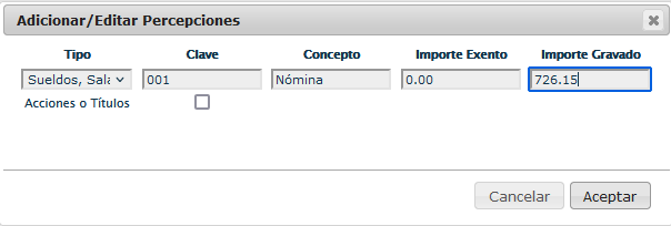 Capturar la información en los campos: “Tipo”, “Clave”, “Concepto”, “Importe Exento” y/o “Importe Gravado” y una vez agregados los datos da clic en el botón “Aceptar” para que la percepción quede agregada en el complemento.