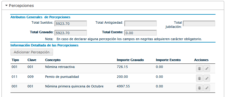 Dentro de la sección percepciones, en el módulo “Atributos Generales de Percepciones” coloca la información solicitada dependiendo de las percepciones que haya agregado. En Total Sueldos colocará la suma de todas las percepciones tanto gravadas como exentas.