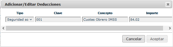 11.1 Captura la información en los campos: “Tipo”, “Clave”, “Concepto”, “Importe”, para agregar la percepción dé clic en botón de “Aceptar”.