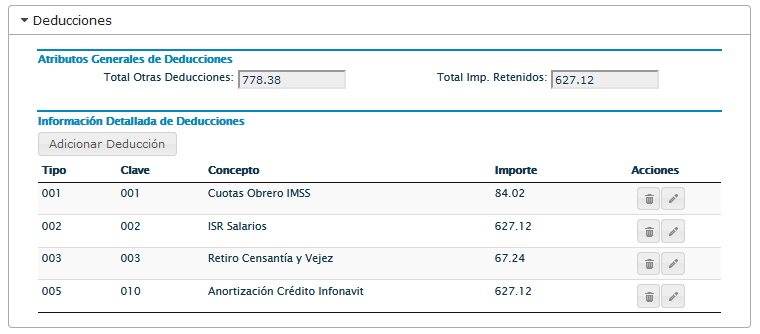 Así podrás agregar “N” cantidad de deducciones para verlas registradas en el complemento.