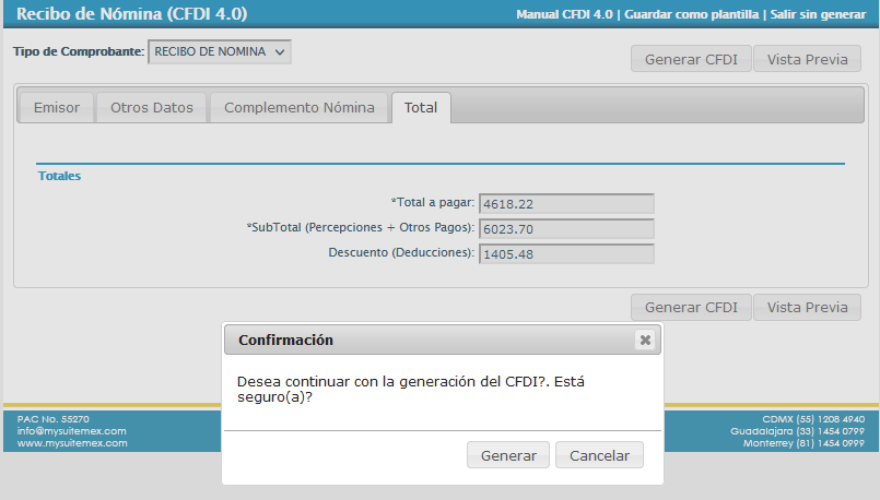Si los datos capturados son correctos en la vista previa, podrás dar clic en el botón “Generar CFDI”.