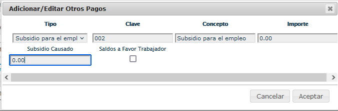 En la ventana “Adicionar/Editar Otros Pagos” captura la información como se muestra en la imagen de ejemplo, para agregar el concepto da clic en el botón de “Aceptar”.