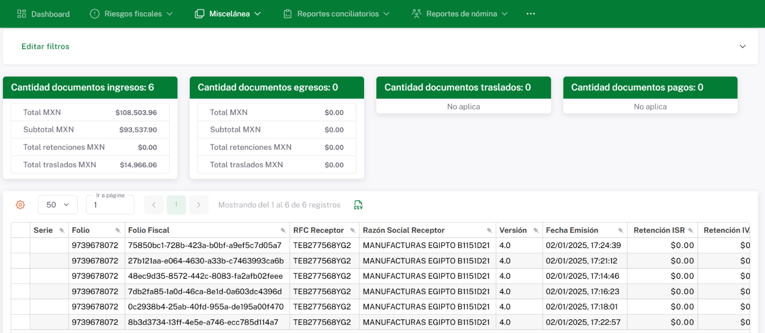 Enseguida visualizaras el resultado con los CFDI de los clientes o de los proveedores, según la opción seleccionada en el campo contexto del mes seleccionado.
