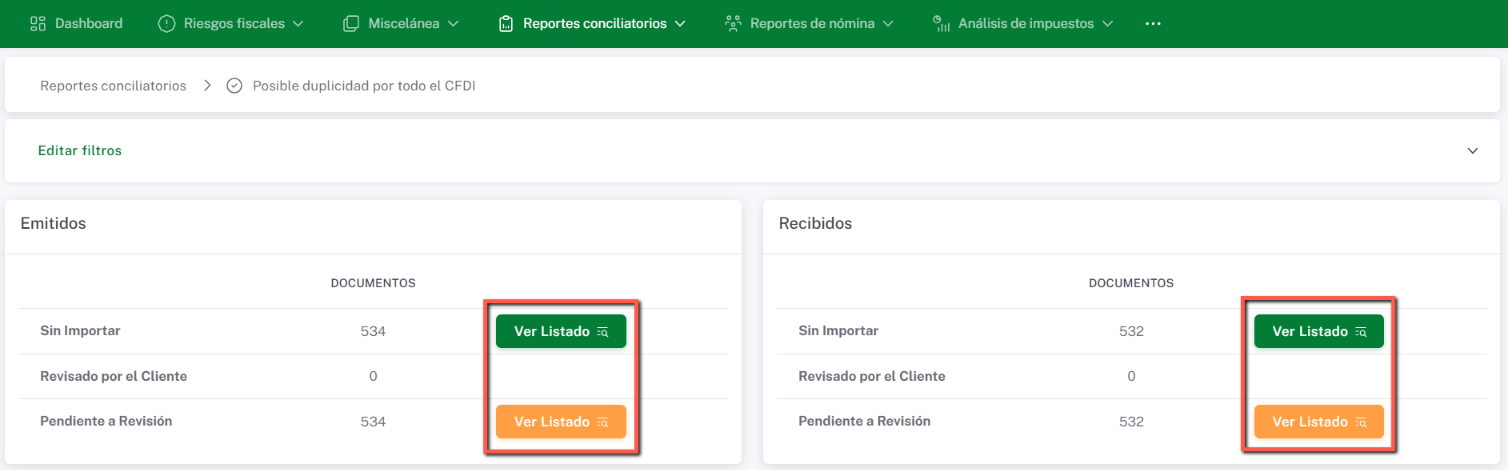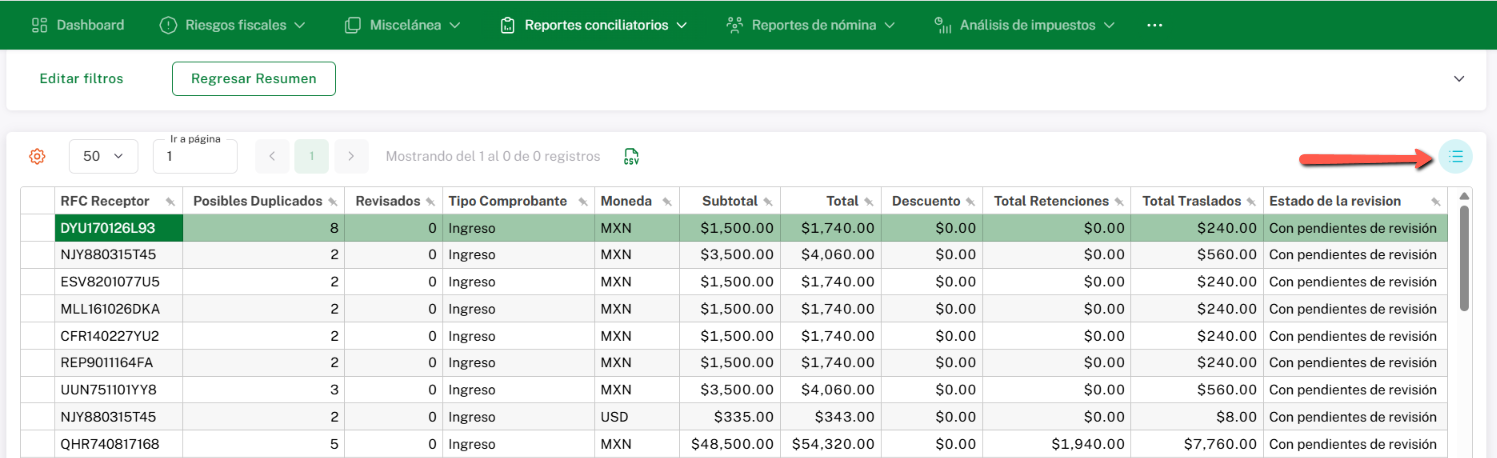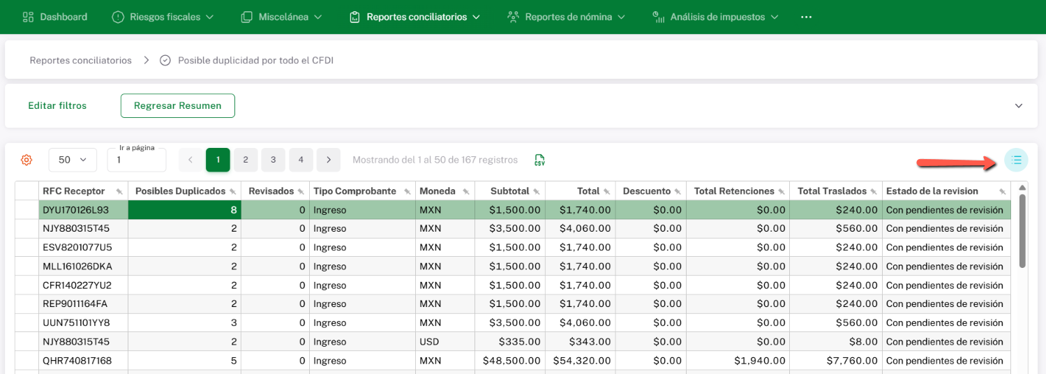 Una vez que des clic en “Ver Listado”, se mostrará el RFC acompañado de la cantidad de documentos que aparentemente presentan duplicidad, así como los datos que coinciden de manera exacta entre los CFDI involucrados.
