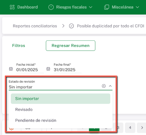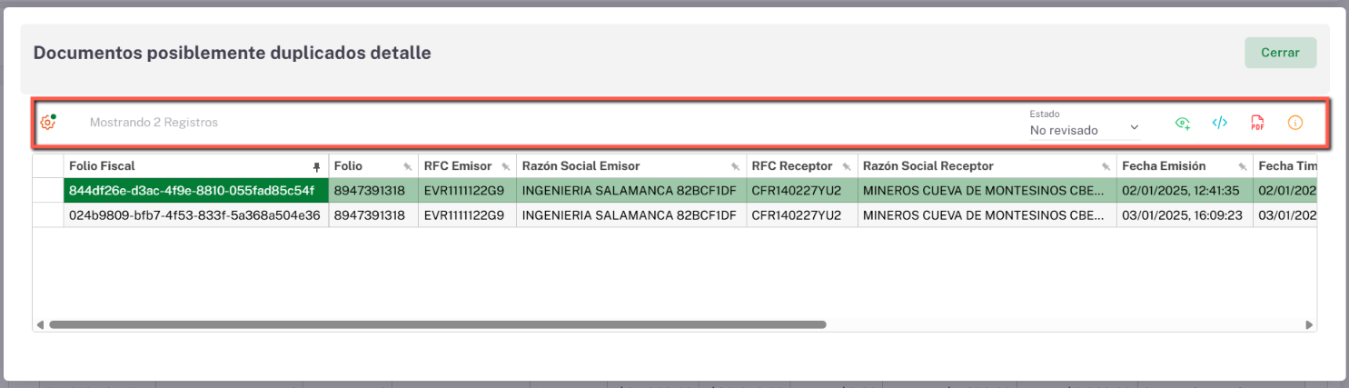 Dentro de esta ventana se mostrarán los CFDI que presentan posible duplicidad. En la parte superior izquierda encontrarás el campo denominado “Estado”, el cual te permitirá modificar el estado del documento resaltado en color azul, seleccionando una de las siguientes opciones: