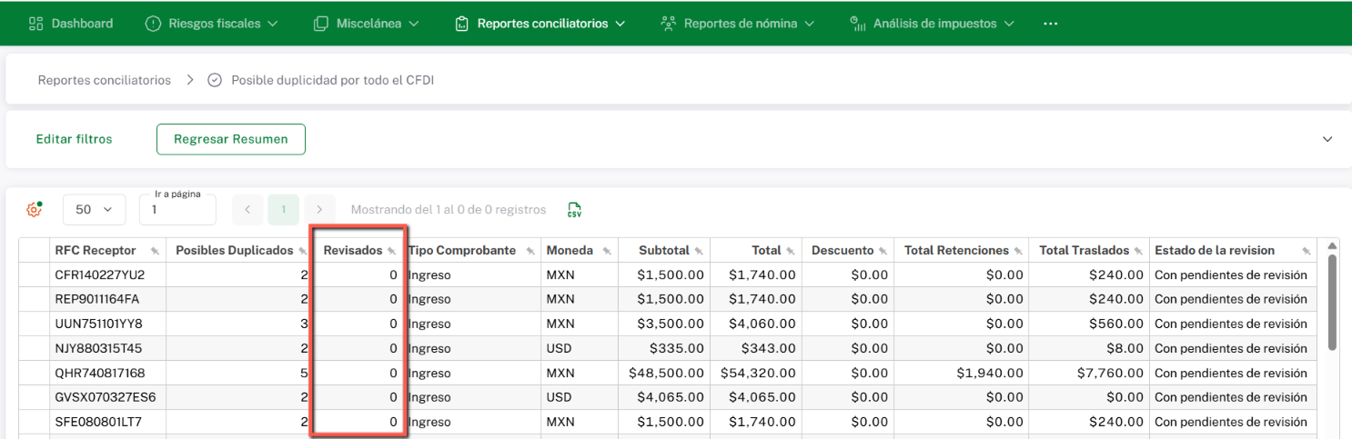 Una vez que modifiques el estado de algún documento, la tabla de resultados se actualizará automáticamente y podrás visualizar el cambio reflejado en la columna “Revisados”.