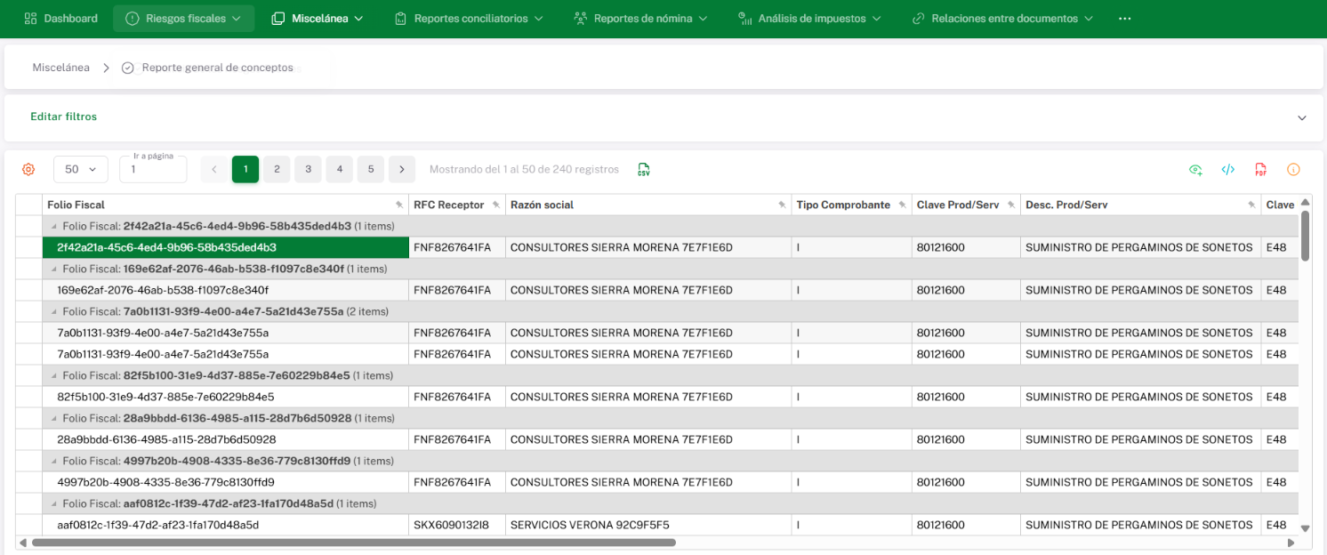 La información de este reporte se presenta; iniciando por el Folio Fiscal, esto te permite visualizar todos los conceptos agrupados de una misma factura.