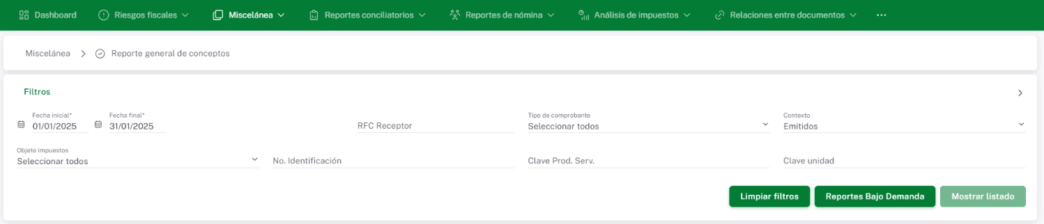 Para generar este reporte debes contemplar como mínimo un intervalo de fechas (Fecha Inicial y Final) determinado por periodo anual, además permite aplicar filtros por: